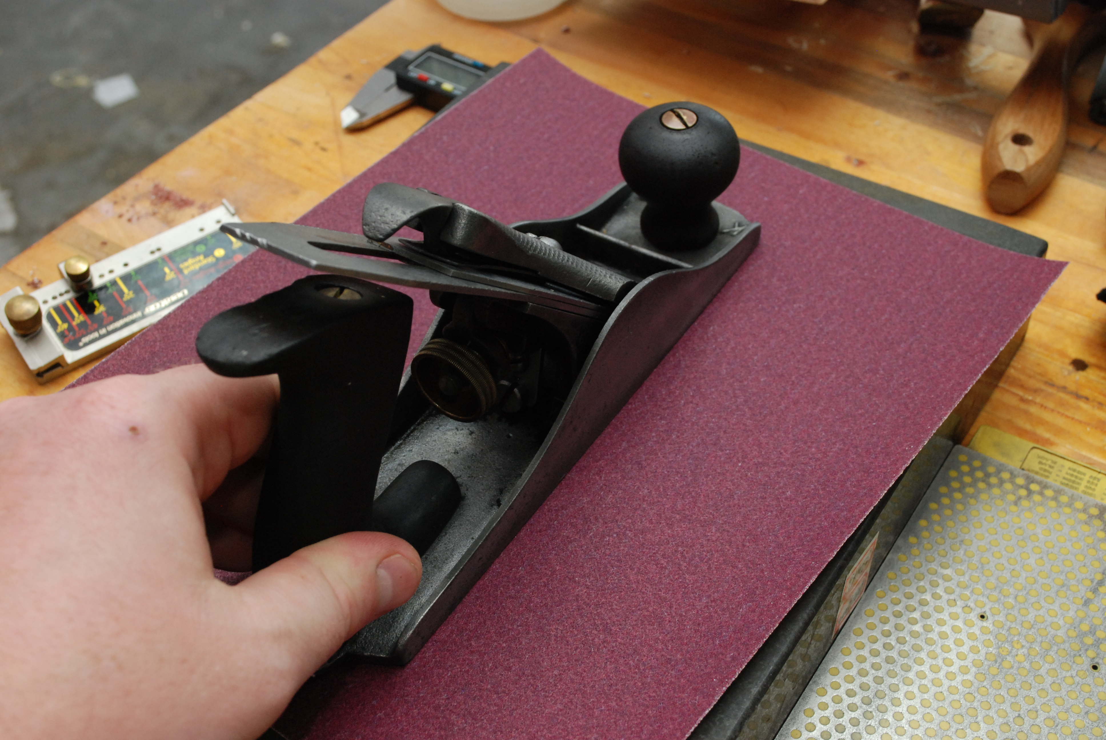 With everything in place and tightened down I could start lapping the bottom. Sand paper on a small granite block is my method of choice. Pretty fast and makes for a good flat surface. Start rough and go smoother. Anything over 400 is probably over kill.
