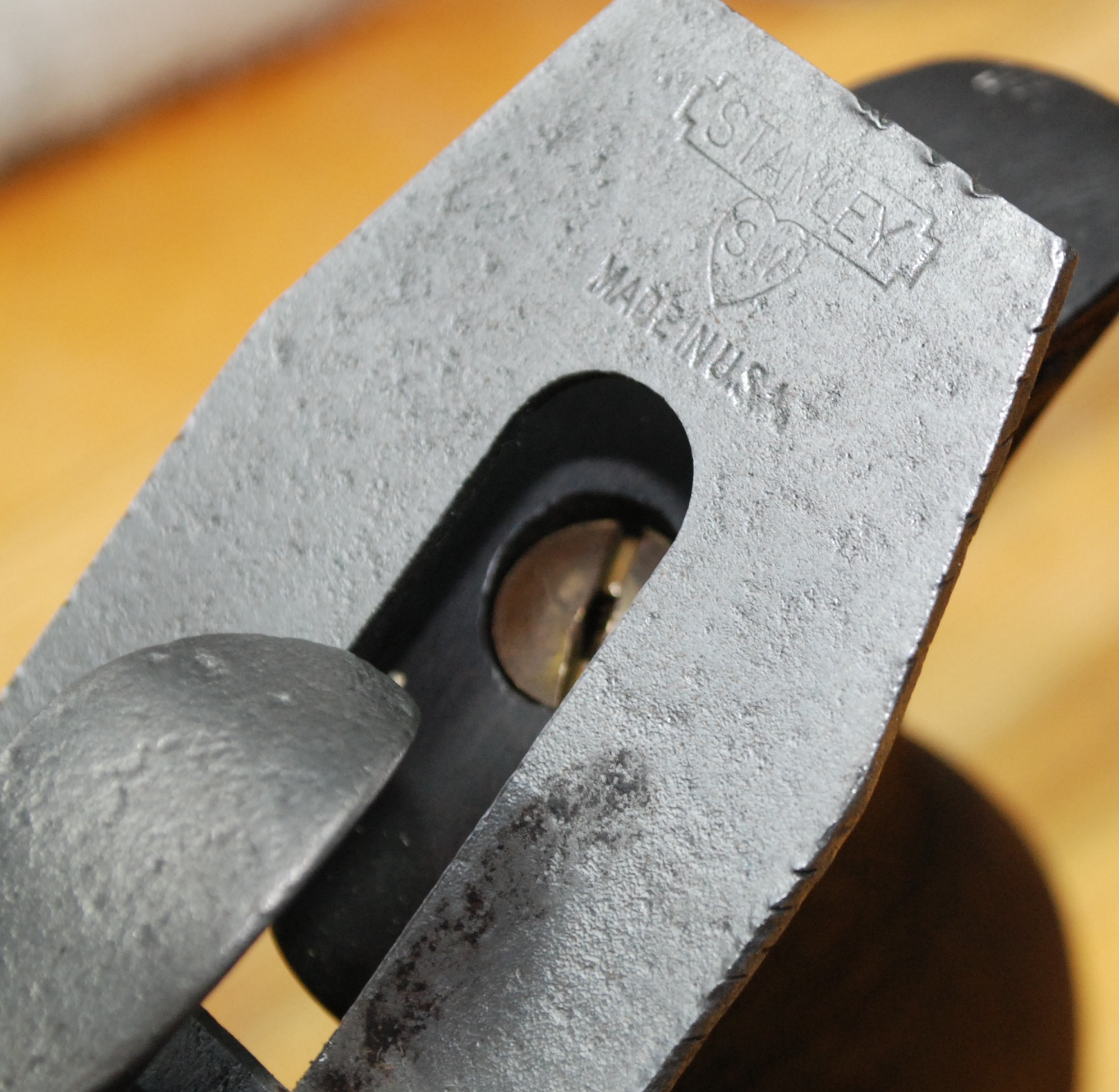 Both were actually pretty flat and in good shape. On the right you can see the slightly jagged top edge of the broke frog. I will have to do any lateral adjustments manually. The picture below shows some scarring on the iron from aggressive adjustment with a steel hammer.