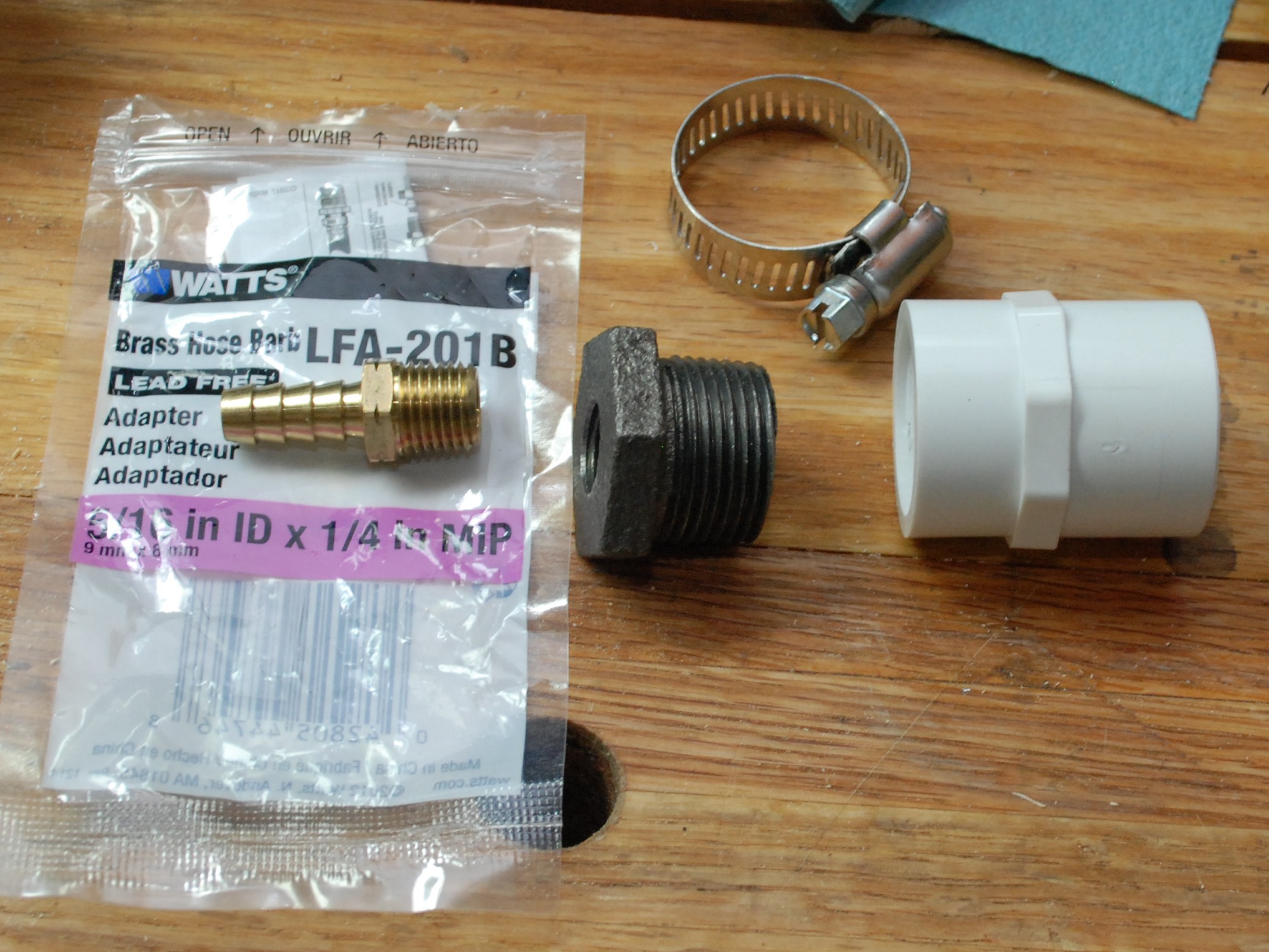 DSC_0054 Published May 31, 2015 at 2013 × 1510 in Honey Extractor Test Article hose barb to 1/4″ pipe, 3/4″ to 1/4″ bushing, 3/4″ pvc slip to threaded