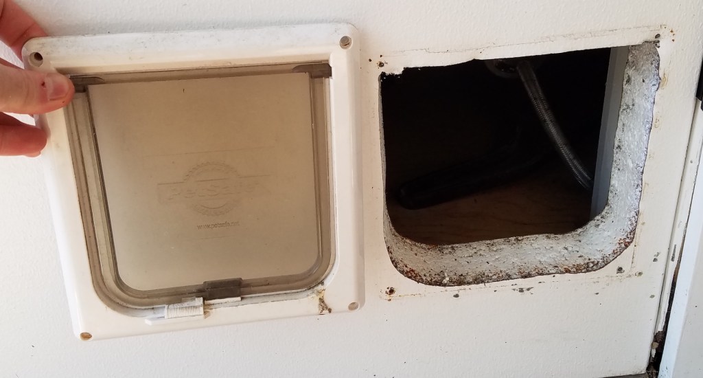 Great is maybe overselling it a bit. And does it count as a conspiracy if I have been openly talking about doing this for months? The Moderately Interesting Cat Door Plan just doesn’t sound as good. Here is the situation. The previous owners of our house had cats. They adored these cats and gave them reign of much of the house. As such there are a number of cat doors around. Some are internal doors, some go from inside to outside (AC leaks!). On top of that there are two exterior doors that had intercoms. The intercoms are dead and gone which leaves a hole to fill.