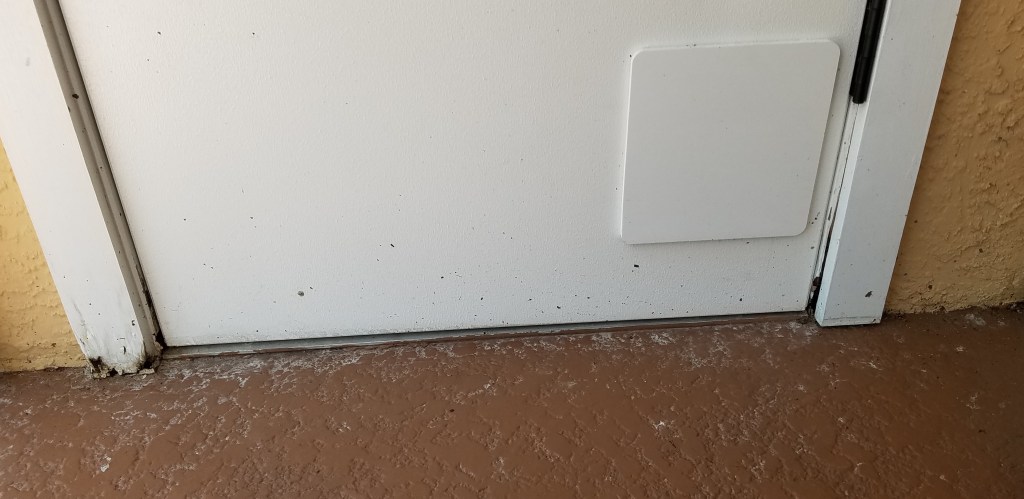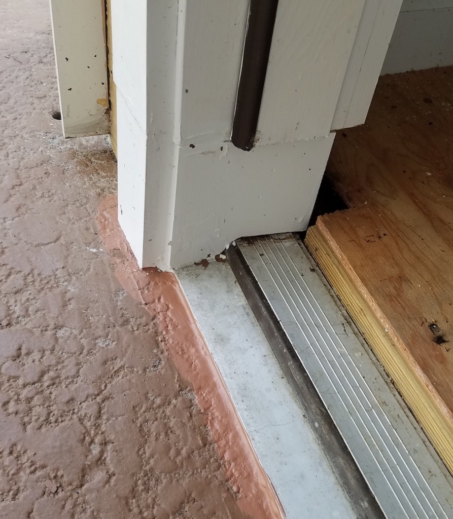 I did some heavy calking to fill all gaps and painting to keep the wood that is left in good shape. A lot of the door seal is missing at the bottom, but I haven’t seen anything splash against this door, just the rising tide of rainwater backing up. The closet is not under AC, so the seal wouldn’t matter for that either.
