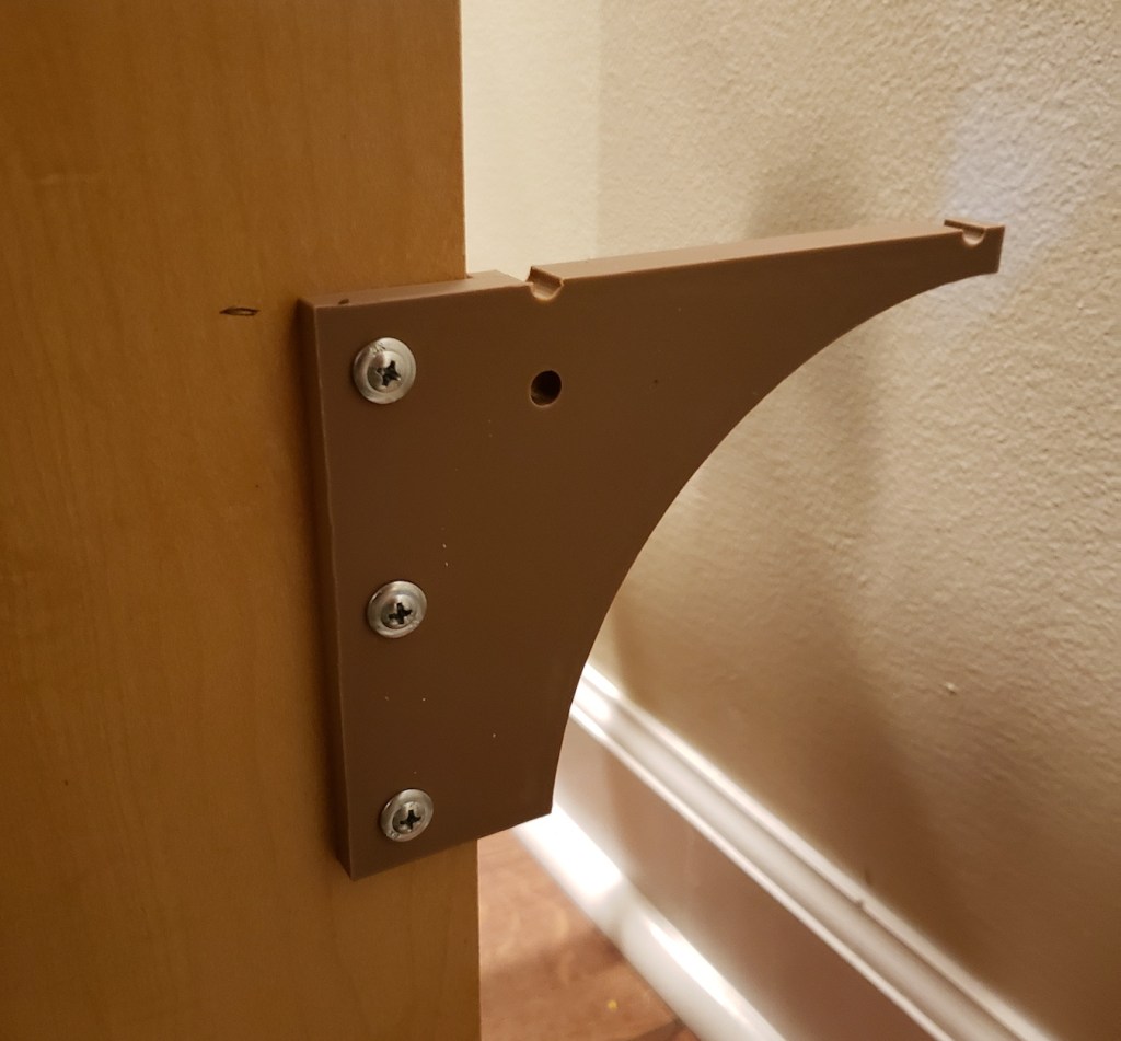 From there I designed some brackets to go under my desk. They would strap down the shelf with zip ties, align with a shoulder to the desk’s back edge, and screw into the sides of the desk.