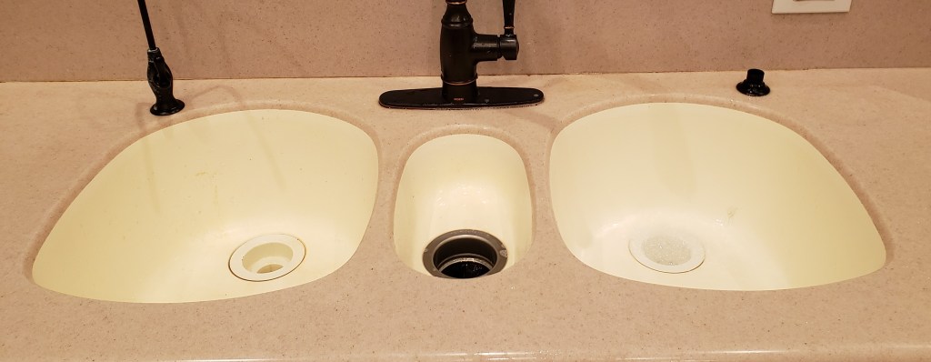 A small story to start: I moved into my previous house, and it had a large white enameled kitchen sink. It was really scratched up and always yellowing. I hated it. It took years, but I finally redid the kitchen and got a nice under-mount stainless sink. It was wonderful. Always looks clean, scratches don’t show, easy to take care of. Fast forward to the new house. The kitchen sink is molded as part of the counter. It is a beige off white, is kind of scratched up and always looks dingy. Plus it is a 3 sink unit and not very efficiently laid out. I hate it.