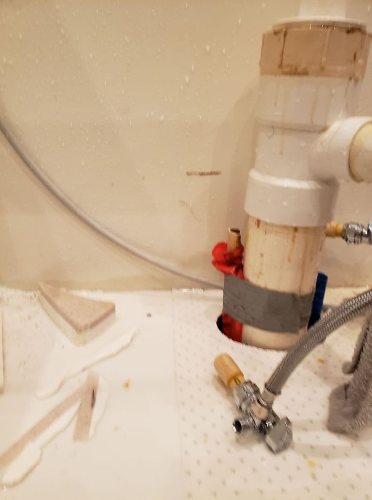 Goosh! It made a crazy geyser! That was unexpected. I drilled big holes in the baseboard and set a massive fan going to try and dry it all out. I always keep extra CPVC fittings around for this kind of thing, but my pvc cement was completely gelled. A trip to the hardware store later I got the supply repaired and had the water back on. The rest of the install was pretty straight forward till I got to the garbage disposal.