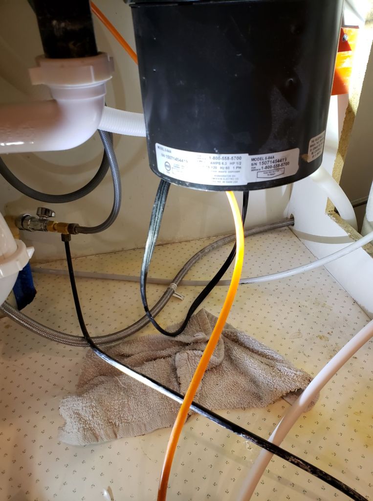 Really hard to capture in this photo, but there is water dripping from the bottom of the motor housing. I guess my garbage disposal was on the verge of death, and the move pushed it over the edge. OK, time for a new garbage disposal. This whole project was more than I bargained for.