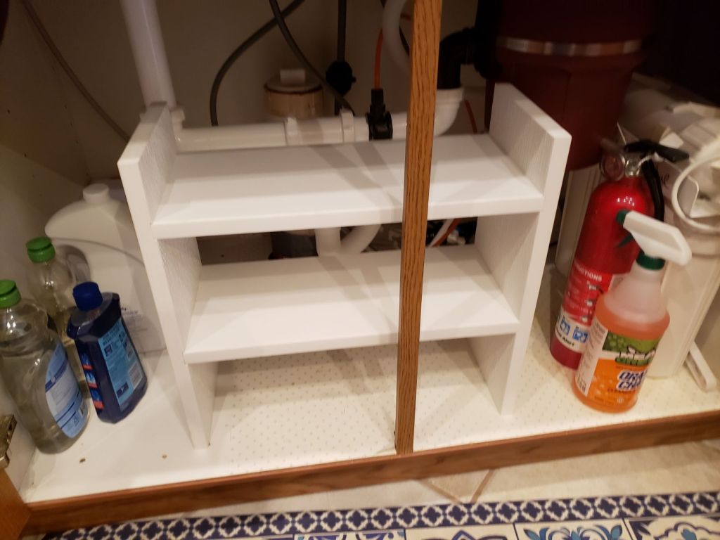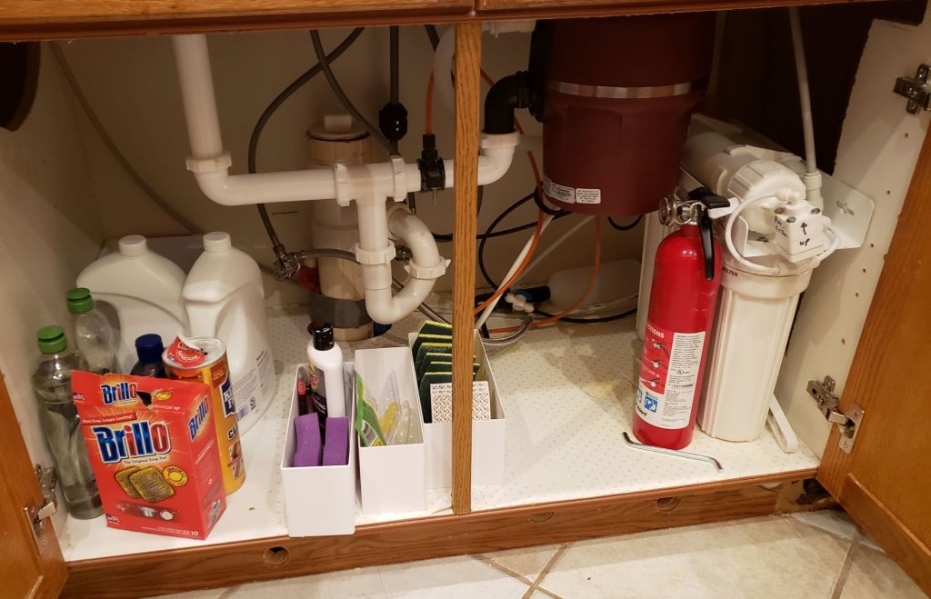 To finish it off, I 3D printed a number of little cubby boxes designed to hold stuff like sponges, glasstop cleaning stuff, and other common under sink items. I have plenty of room for more storage and everything is easy to get to. Kitchen happiness!