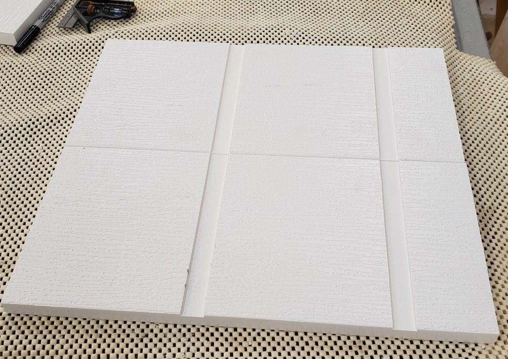 With that repaired I turned my attention to the inside of the cabinet. Our previous organizer didn’t quite fit because of the new drain layout. I picked up some PVC trim wood to make a shelving system out of. I clamped the two uprights together and ran a matched pair of dados to align and support the shelves. The shelves were held in with PVC cement like you use on piping and a few exterior grade screws. Very sturdy, and it will never rot!