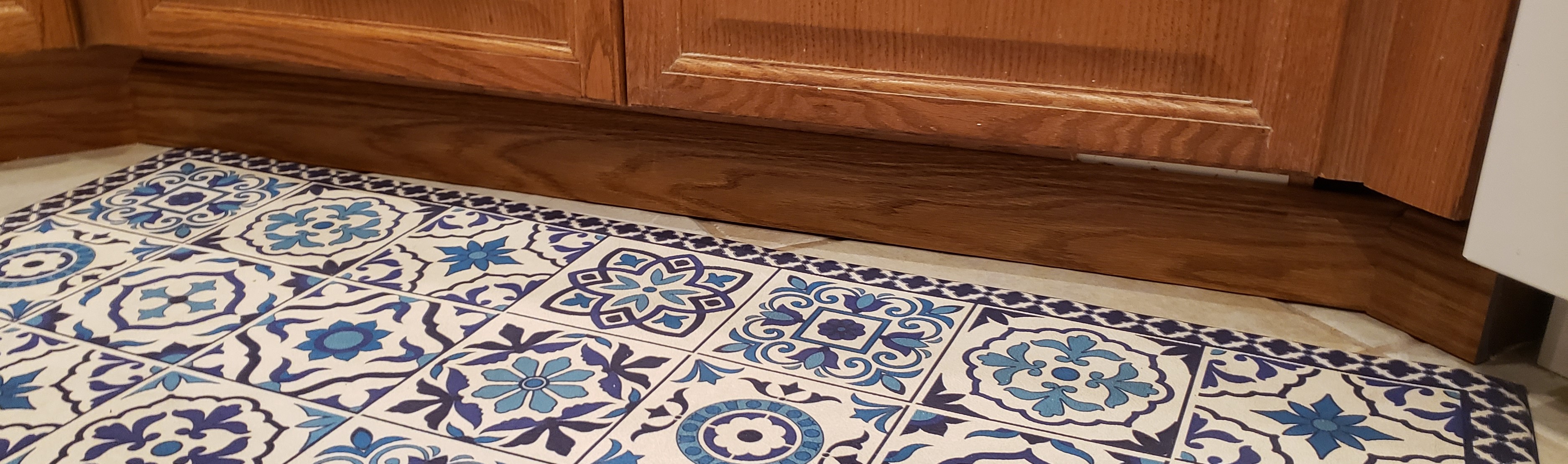 The top looks great, but the toe kick is trashed from where I ripped it out to get everything dry underneath. Lowes has some plastic trim that is finished in a way that matches my cabinets really well. It is molded base board instead of flat toe kick, but you have to get down really far to tell the difference.