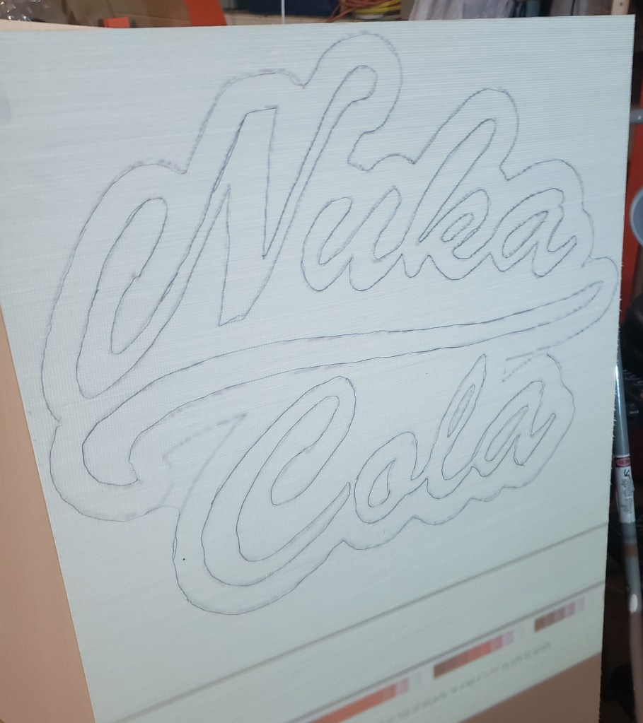 I am also a fan of this funny Russian guy that makes signs with lots of skill and few tools. He did a few different fallout based signs, so I had to follow his lead and make my own Nuka Cola sign. His methodology is simple. Project onto a piece of plywood with a cheap projector, trace, carve those lines in with a dremel so you can see them after you paint, then paint the various layers. I still managed to mess up a little. First up, the projection.
