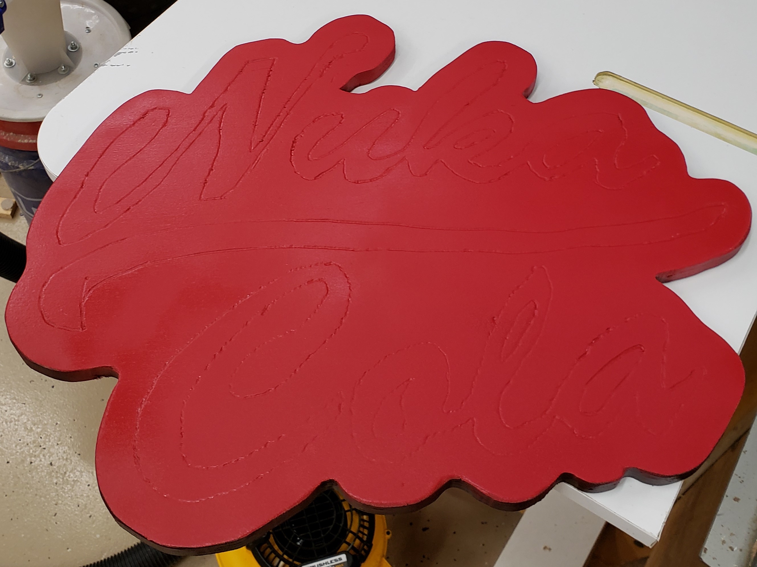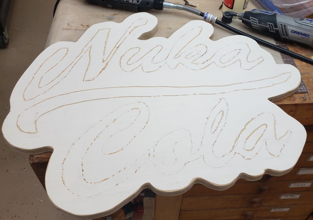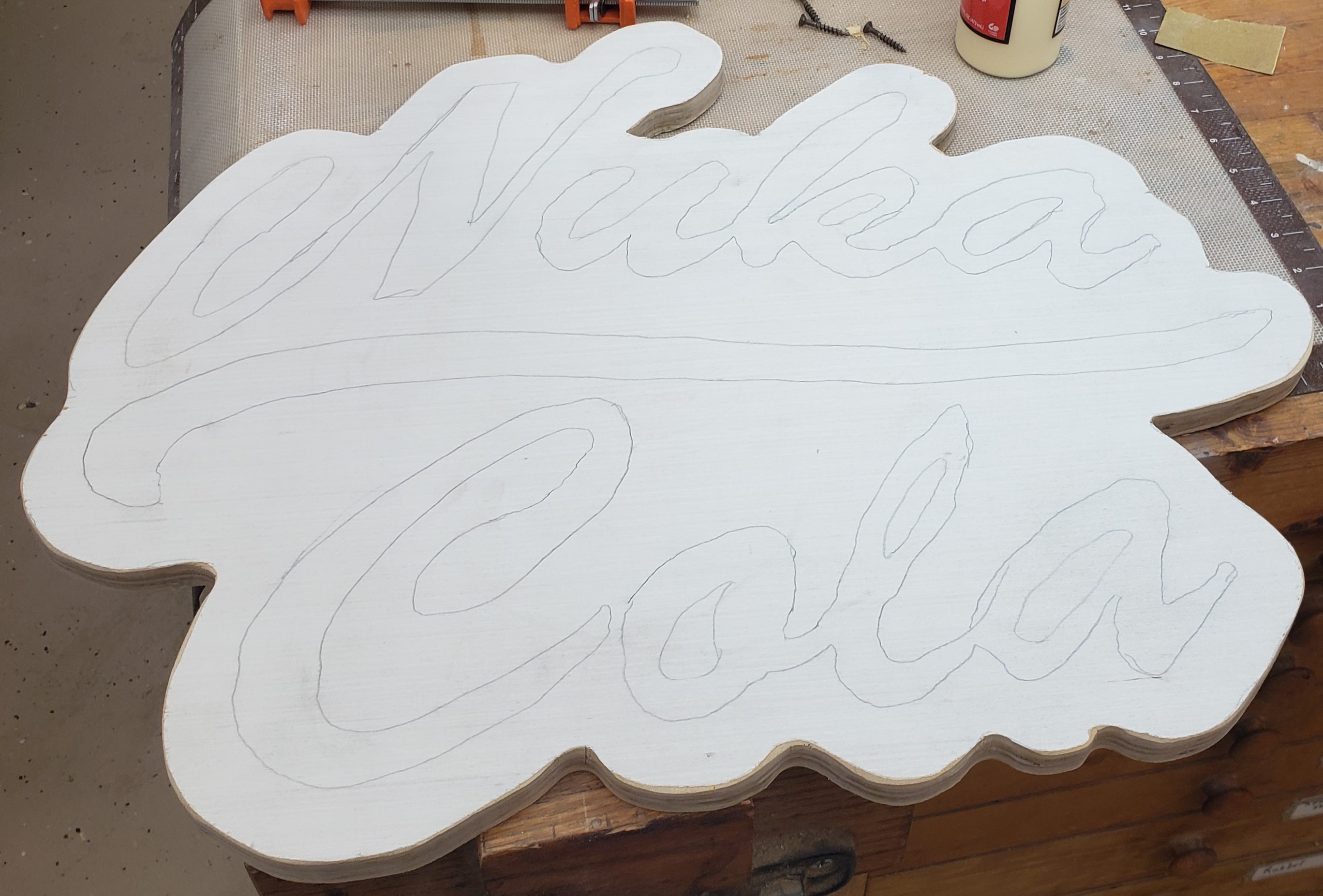 I found a rough text/logo of what I wanted and used inkscape to make the offset for the sign outline. I hand traced it and moved on to cutting the outline. It took a little special sanding to get it all straight and clean, but I was happy with the shape.