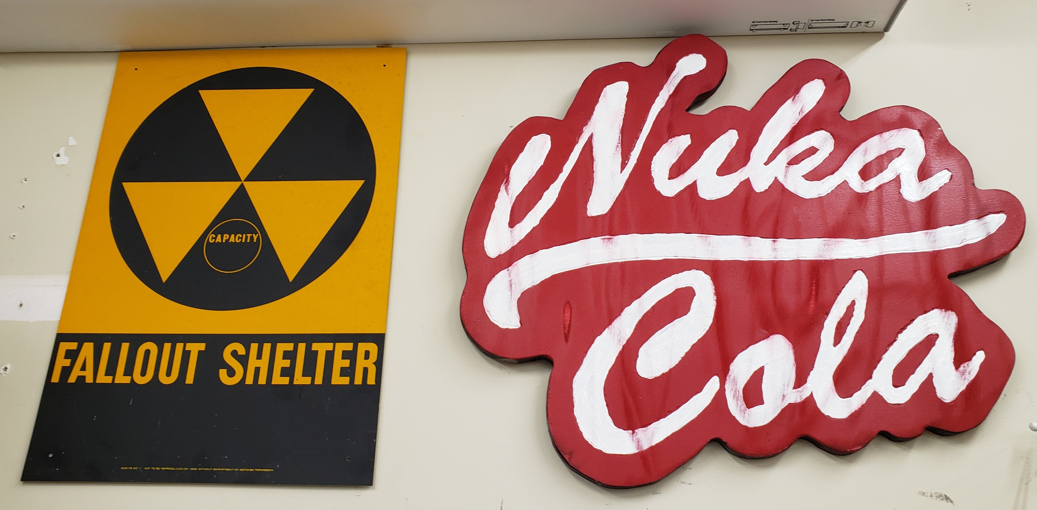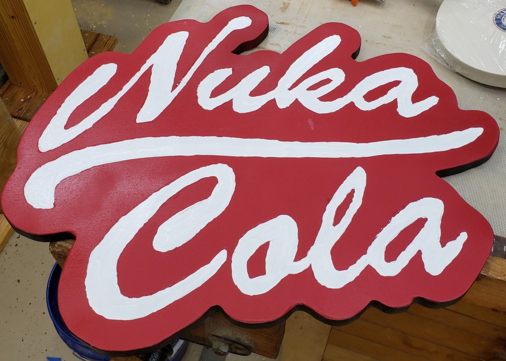 Overall I am really happy with the project, but I need to work on my dremel carving technique and hand painting. I have another sign idea in mind, so hopefully the lessons learned will be applied there. It looks great in my shop next to a metal fallout sign I got ages ago.