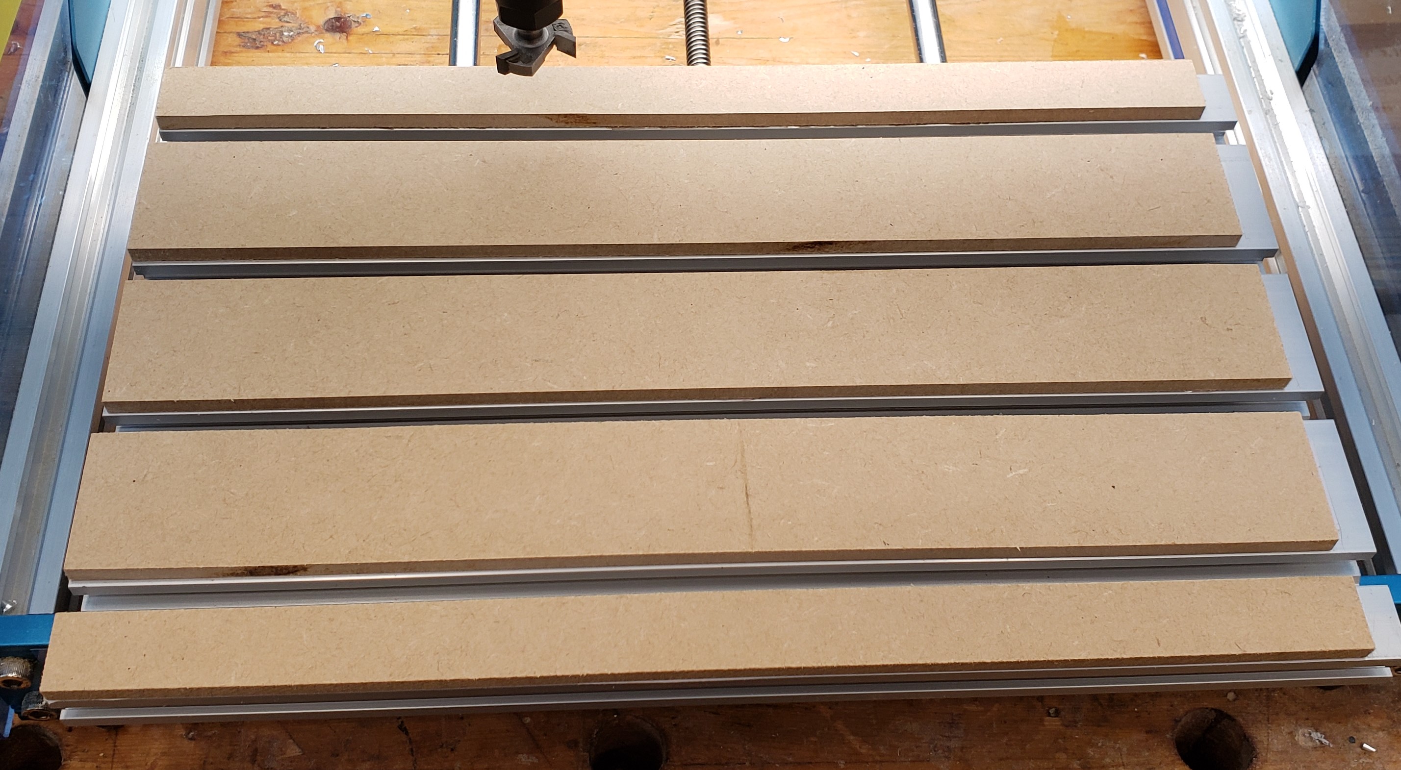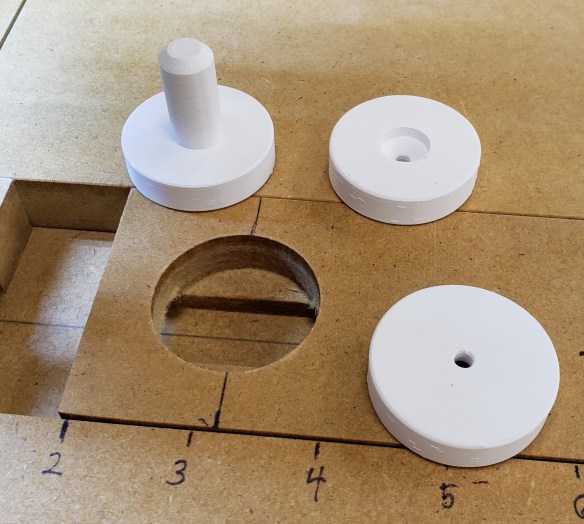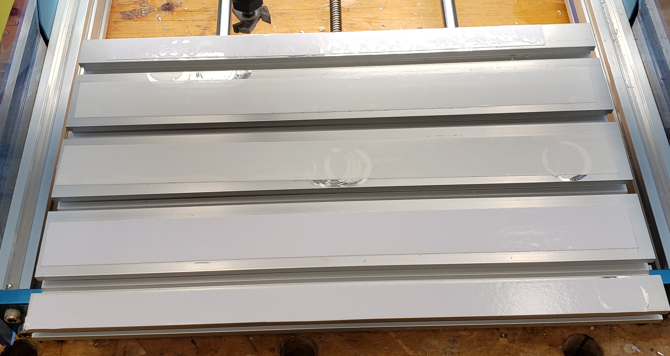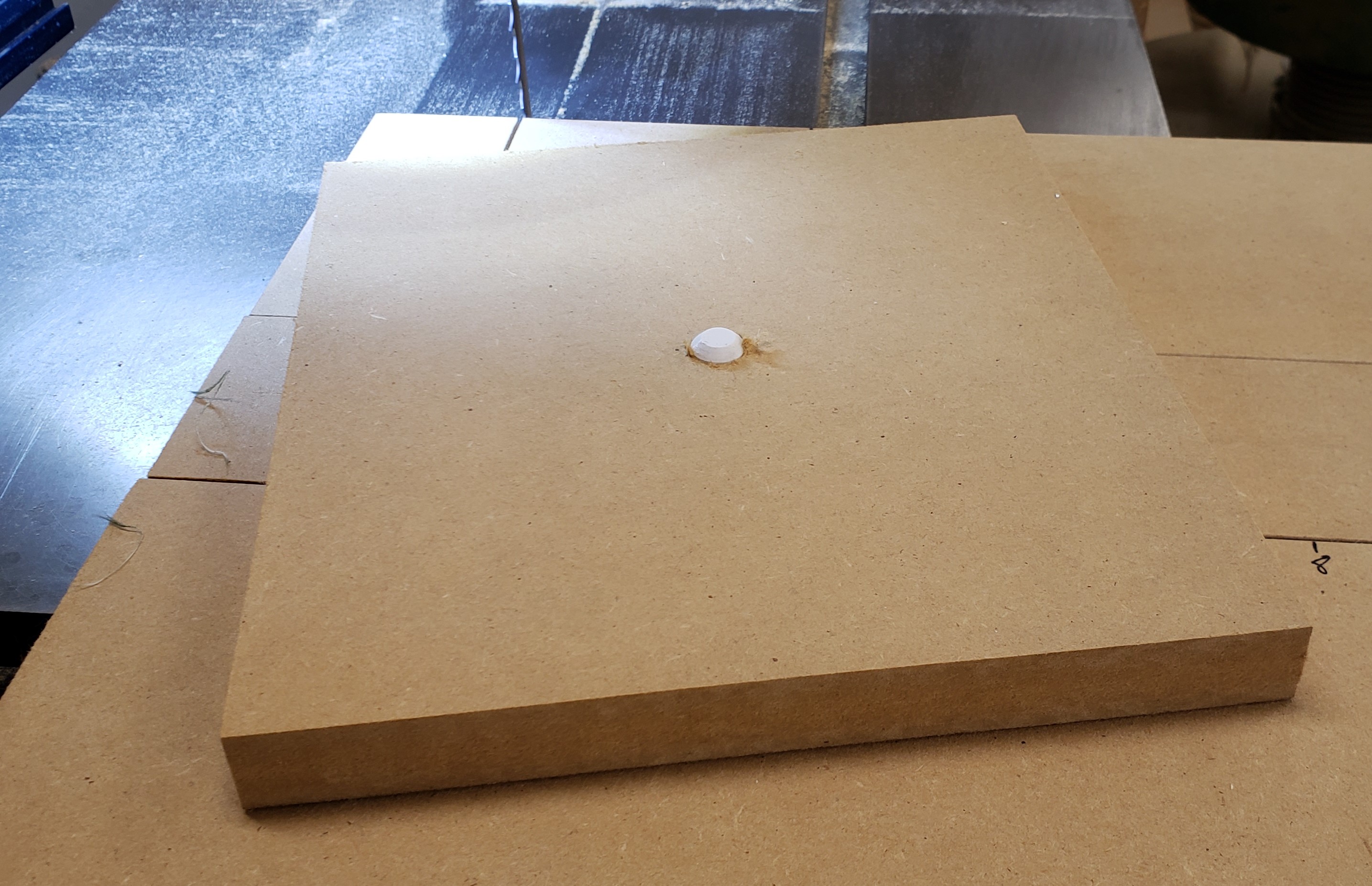 To keep from drilling tons of holes in my waste board I made the first operation to drill a hole for my screw, then pause the program. That drill operation is quick, and doesn’t stress the double sticky tape. With the screw installed in the same space every time, I reused the hole in the waste board, and knew it would be out of the way of my cutting. The results were rough, but they worked.