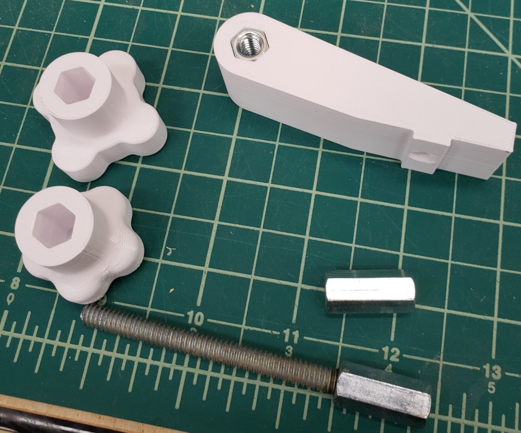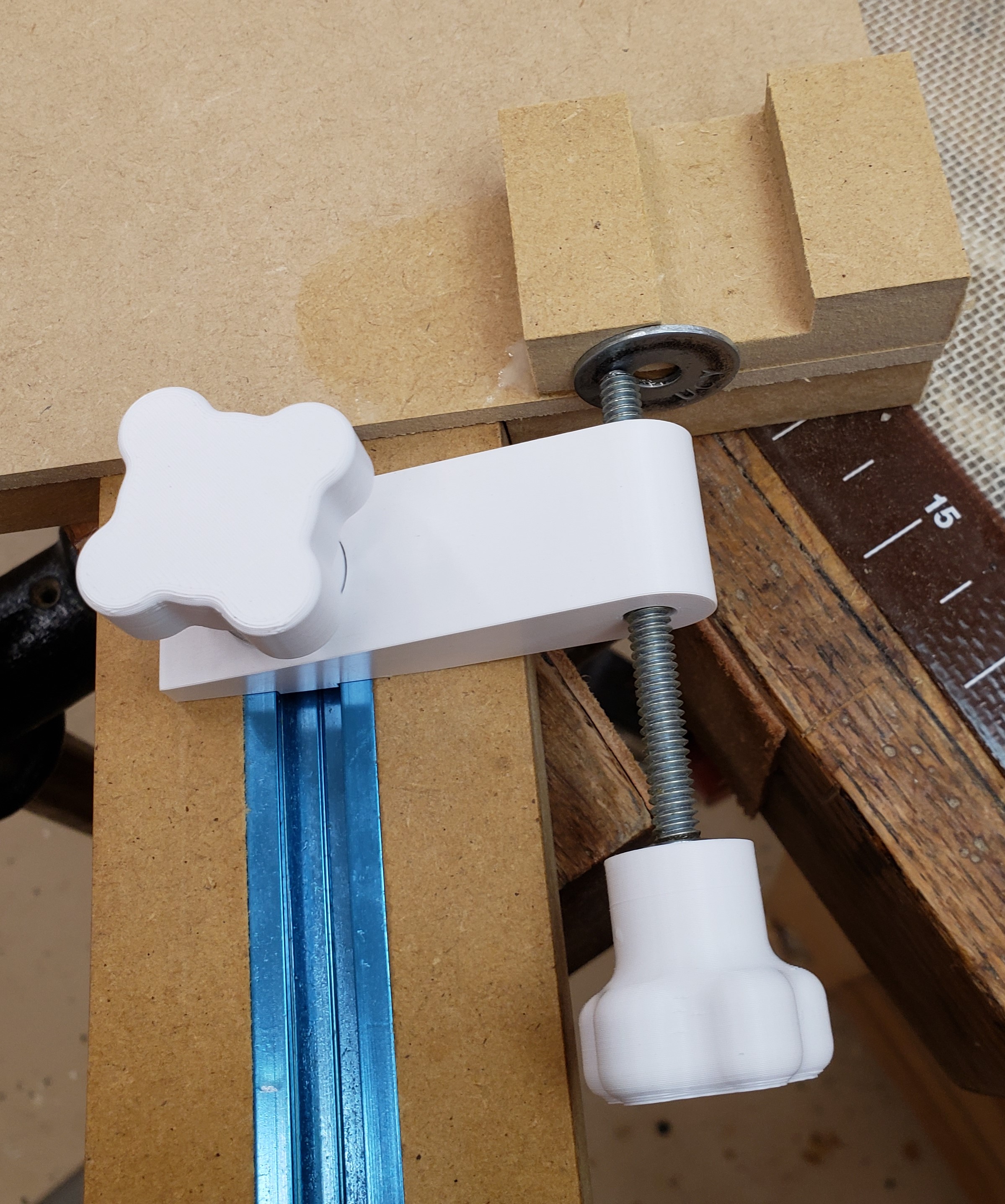 Next the handle blanks got sanded, a round over, and more sanding. I figured I would make their look a little more industrial, and set to counter bore the front for a screw. Lots of stop blocking and clamping was needed for that. This would be stronger than screwing through the back, and easier to install. I like the aesthetics of it too.