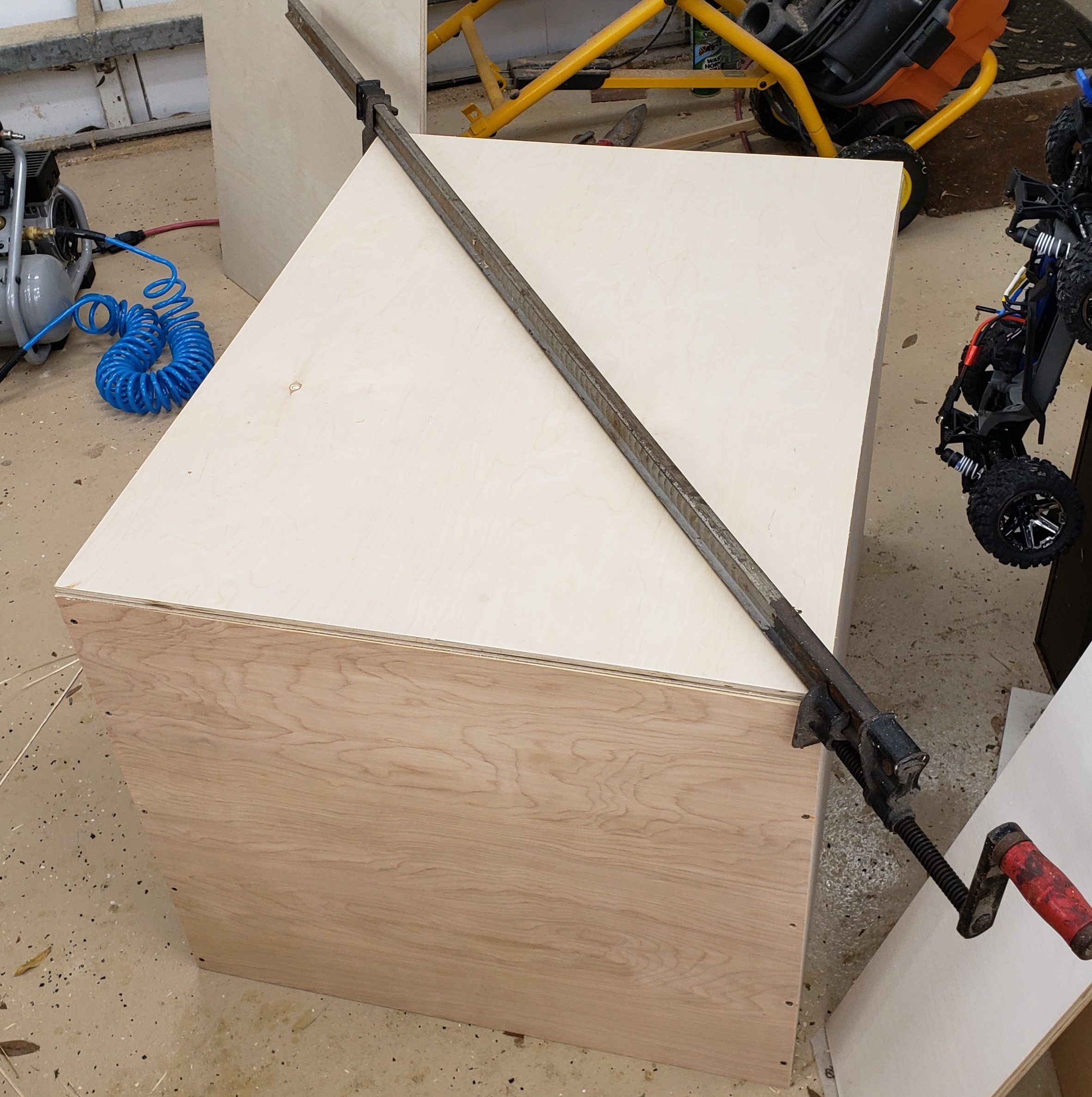 Next came the carcass of the cabinet. Nothing special here, just a box with an open front. I had to be very precise though, if the sides crept in, I couldn’t fit my drawers, and if it got too tall, It wouldn’t fit in the right spot in my garage. I had a little squareness issue, and had to break out my biggest clamp to fix it while installing the back.