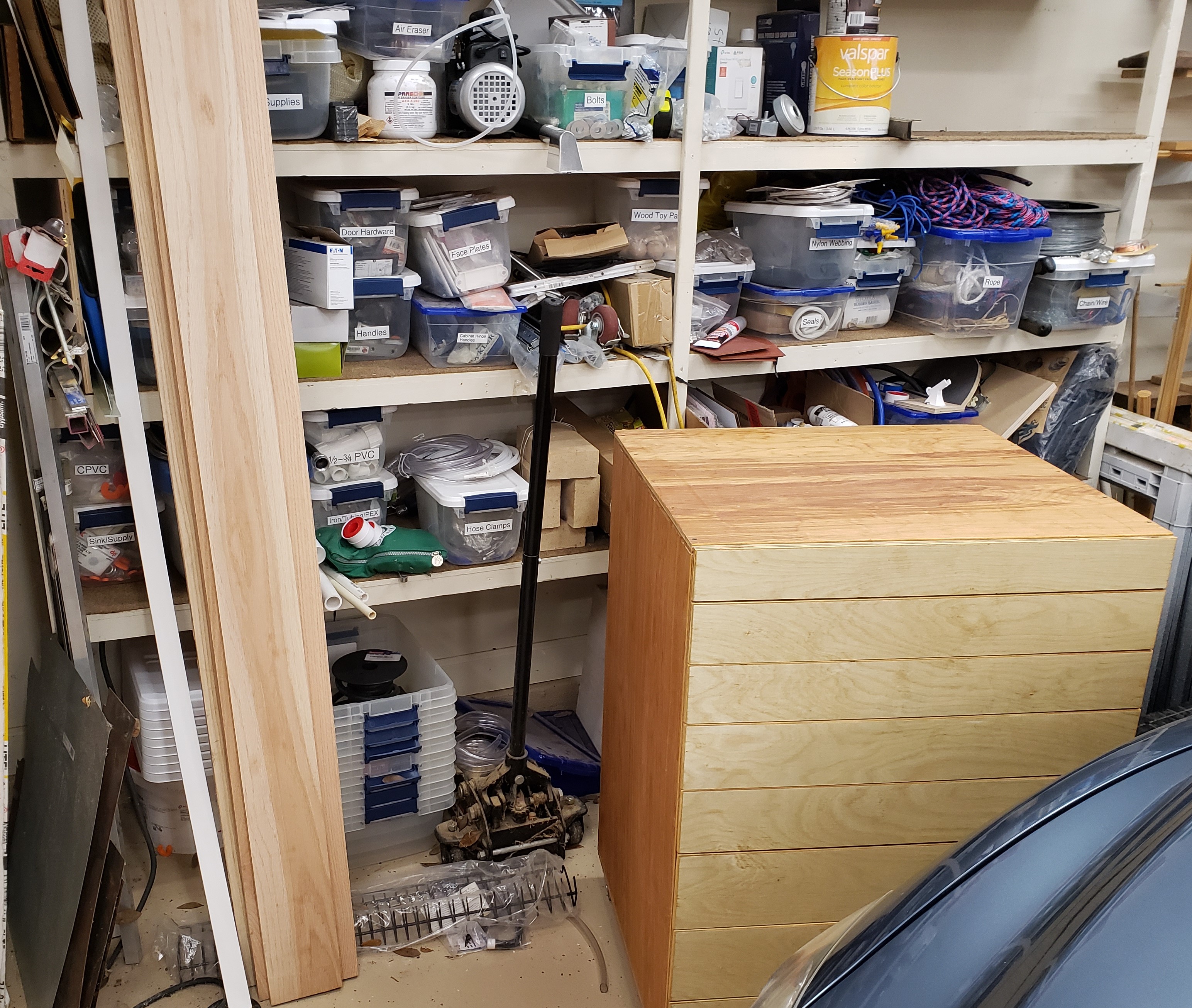 In looking at my materials storage area, I have a lot of plastic bins that are organized, but maybe only half full. I have made hardware drawers in the past and love their organization and dense storage capacity. This new cabinet will be much larger and deeper and use full extension metal slides. I started with a lot of planning. I wanted to maximize the materials I used, my limited shop time, and the space available.