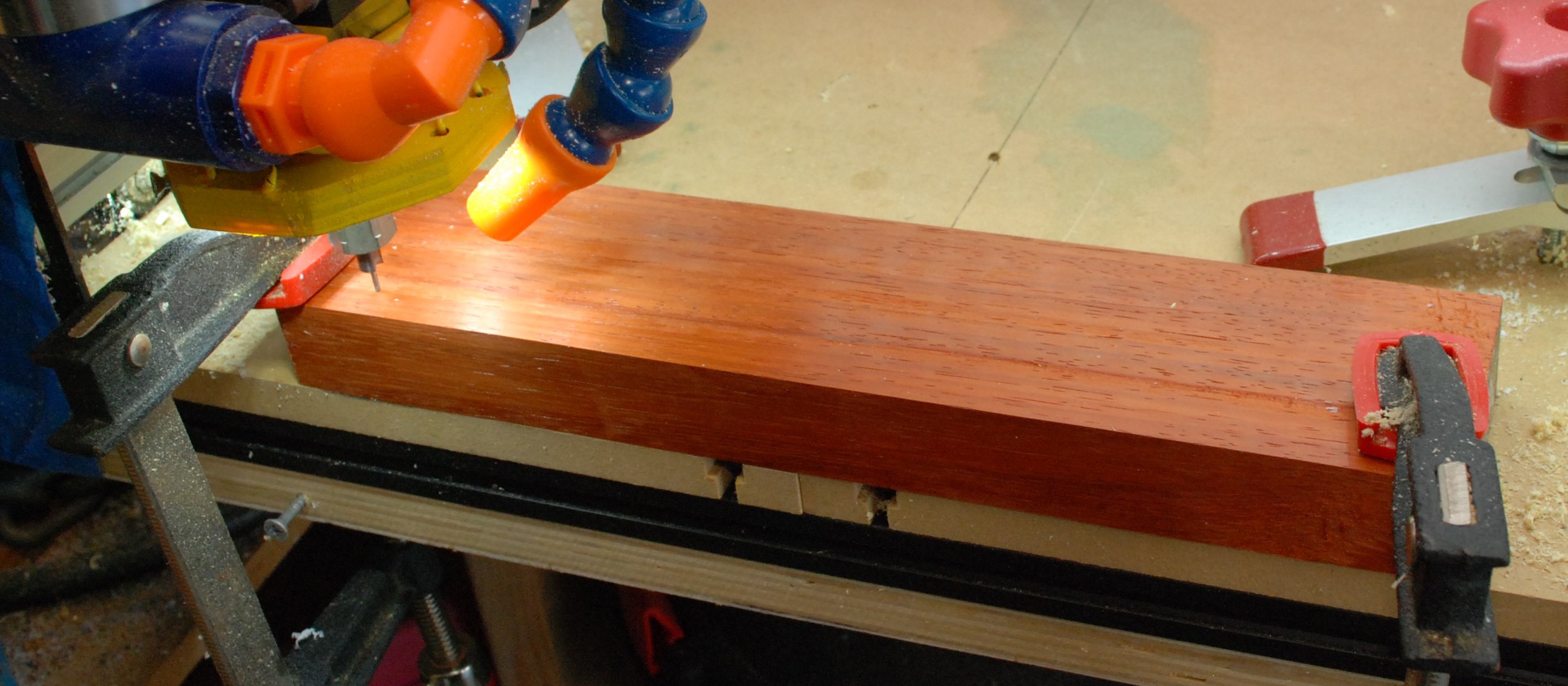 This version doesn’t need the cam clamps, the vise like action of the two threaded screws has plenty of clamping power. Similarly, I didn’t need a height stop. I could very accurately feel when the board was flush with the top of the jig. The second round of drawers went very smoothly with this jig!