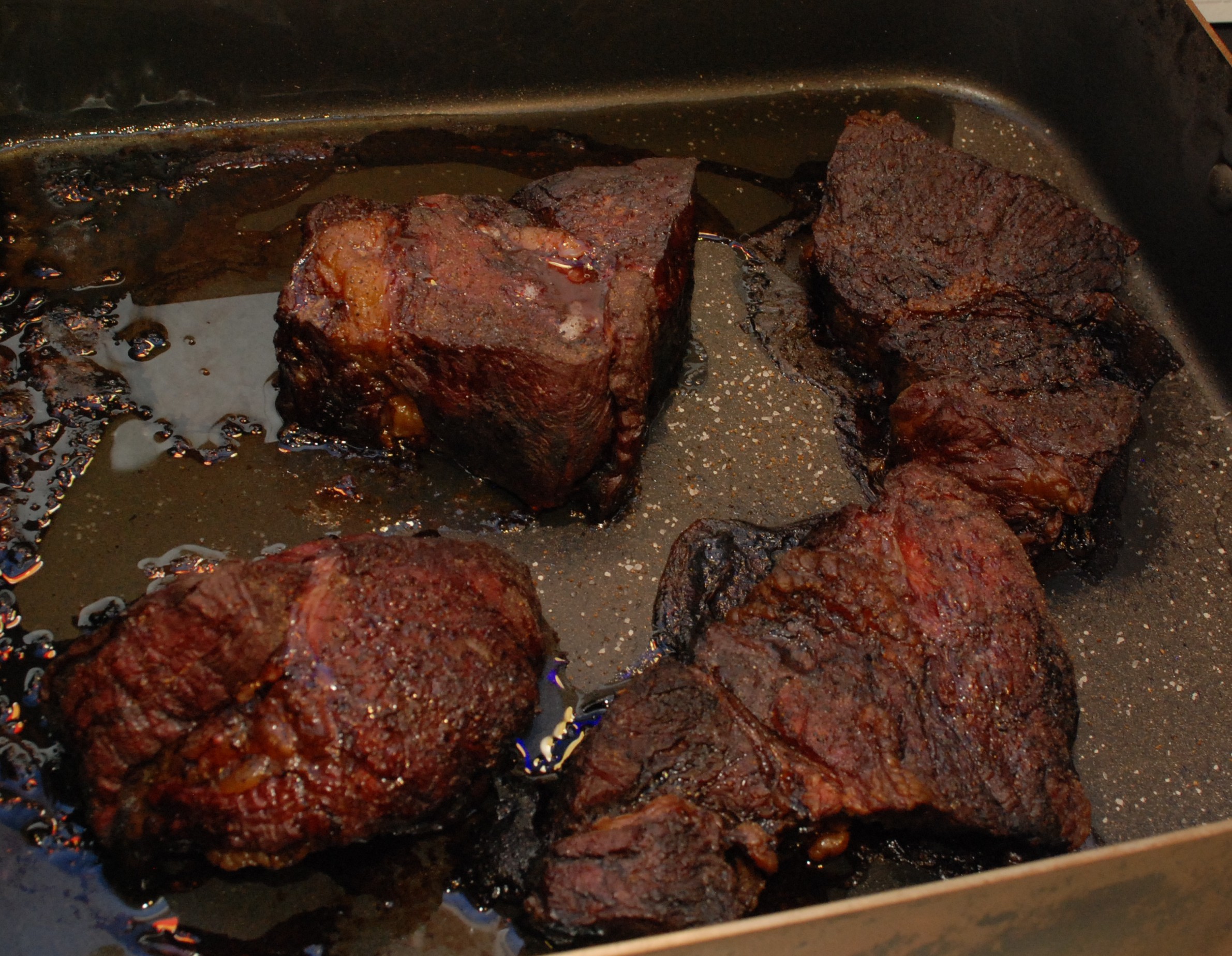 I wrapped them in foil and stuck them in a cooler for a few hours till dinner. I was going for pulled beef but ended up a little dry. Next time I will wrap when I get the color I want. It holds true for pork butts, and it seems to hold true for chuck roast.