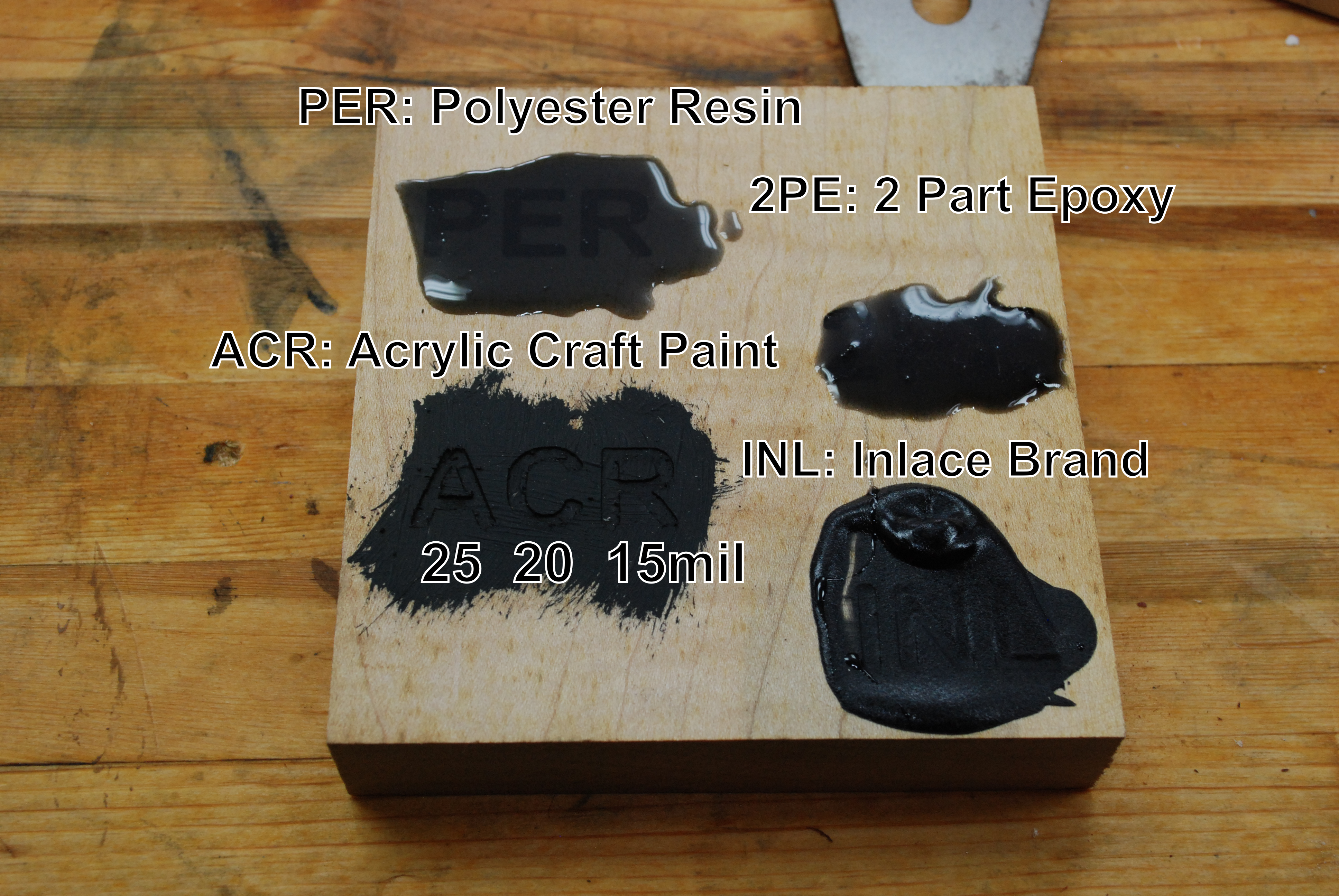 Finally I settled on a quick clear coat to seal, and spray paint. It makes the router cuts dark and visible, and is easy to apply. The sample board turned out well enough, so I moved on to the real thing. I will work on improving my epoxy inlay techniques later.