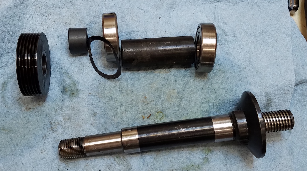 Careful application of force was all it took to take everything completely apart. Here is what it looks like with all the bits fully disassembled. The right most bearing was very much seized.