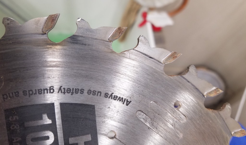 I feel like I switched it off pretty quickly, but I may have been in shock for a few seconds. The time that it did take me was enough for the wild blade to lurch forward and start cutting into the guard just above the top guide bearings. It cut through the metal guard and left a gash a few inches tall. Metal shavings were all over the tape top. The teeth are a heavy set tungsten carbide for ripping, so they are quite capable in soft metals. I did manage to chip a few teeth in the process.