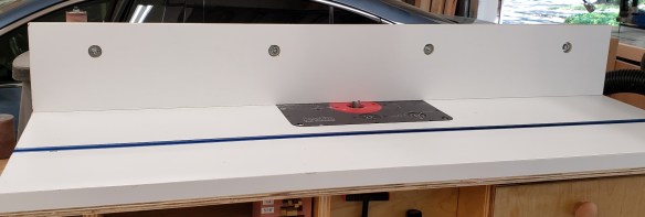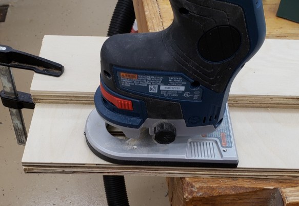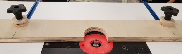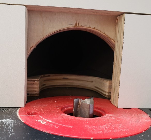 With the legs roughed I again used the pattern bit to clean them up to the line. I just bought this fancy compression pattern bit because of how much I do pattern routing. Oops, the piece is too tall to cut it all in one go. Off goes the top bearing, I will have to take one bite, then increase the bit height to do it again.