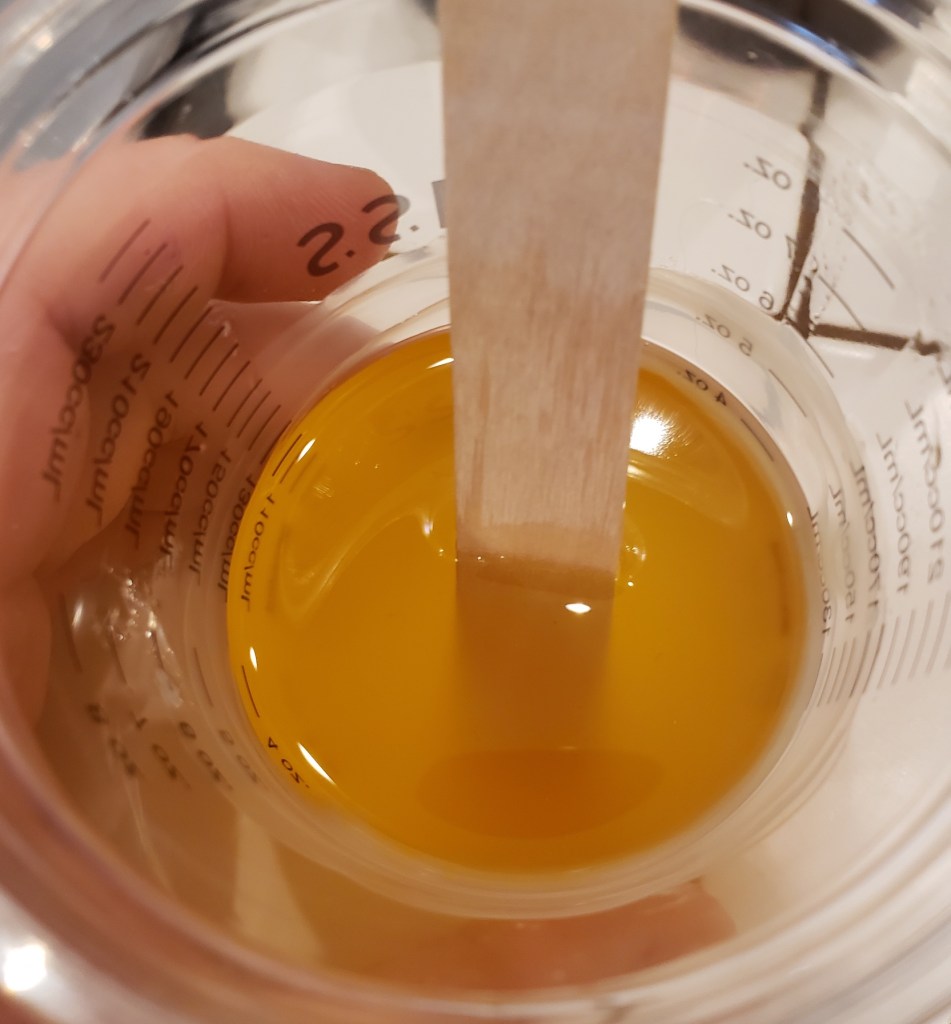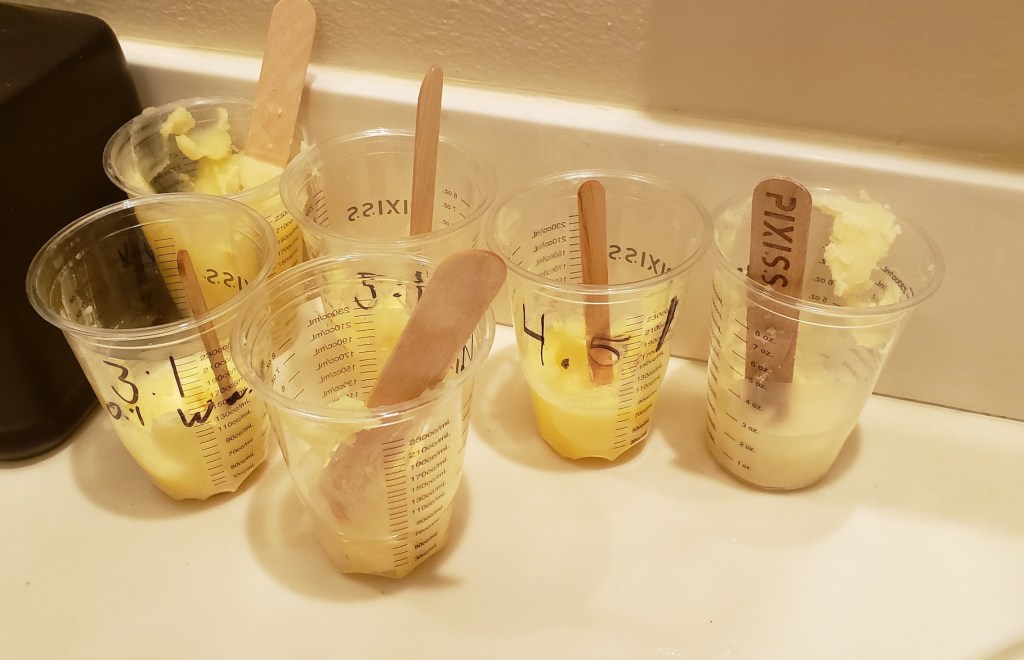 I would call it a hit or miss process, but it was mostly miss. Almost everything was too stiff. I kept adding oil to the first batch till I almost completely filled the cup. The ingredients for the oil are kind of expensive. I should have started with a cheap oil at the right melting point instead of my beard oil. The shea butter was making it difficult, so I removed that ingredient. In the end I found a 4.5:1 ratio of oil to wax that was soft enough to spread, but hard enough to hold. My bathroom was looking like an odd place for a while.