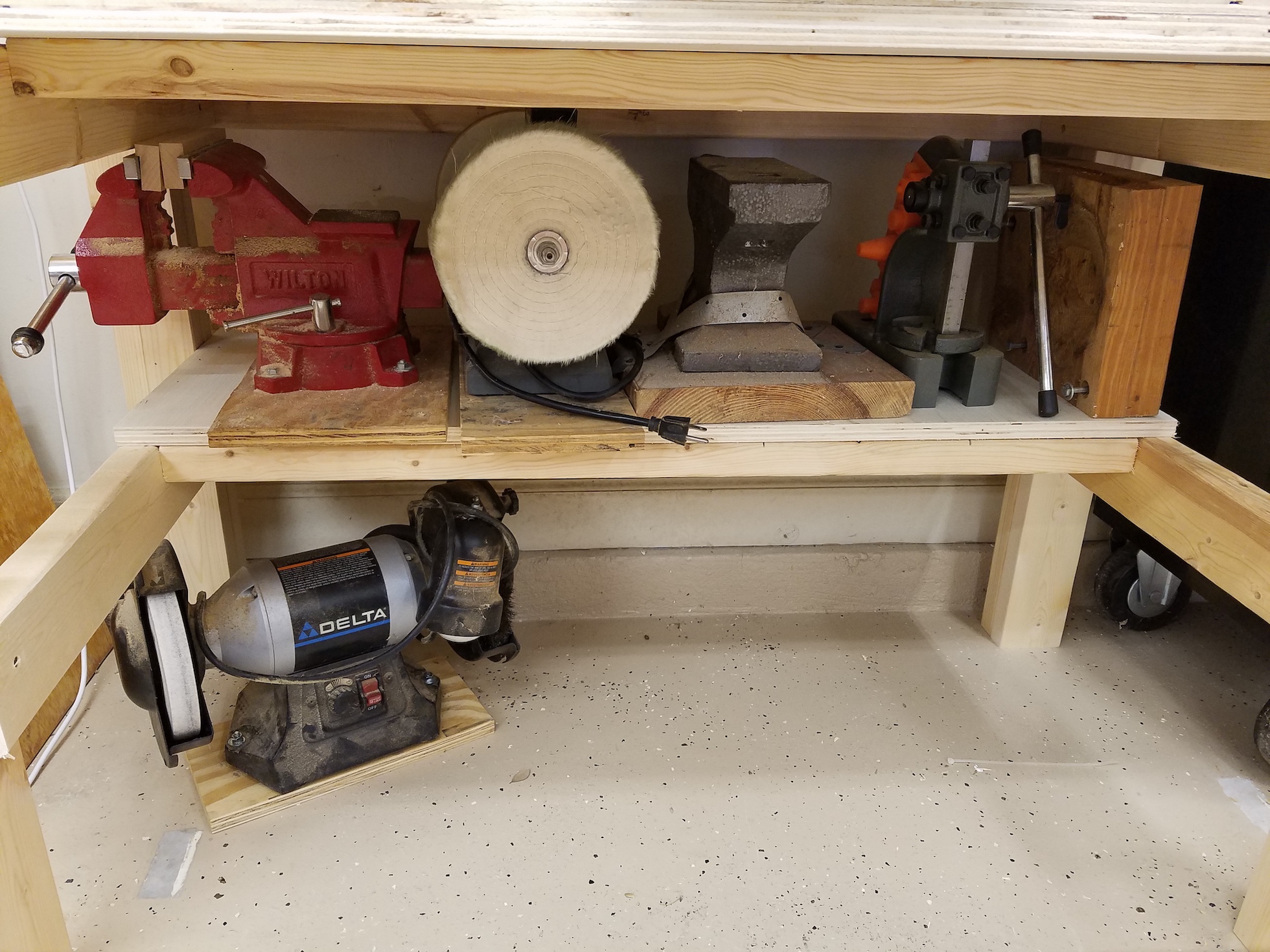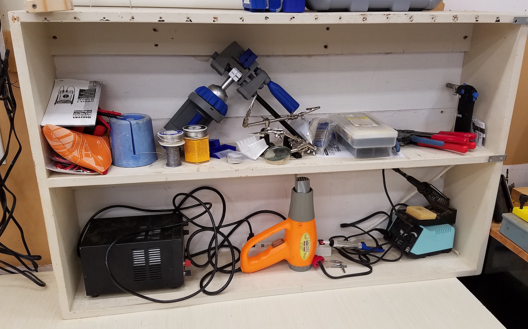 I always keep a big exacto blade and a few deburring tools around in my shop. They tended to float on my messy table top and get lost (part of the reason I have two deburring tools). In an effort to keep that area clean I made a tool holder that screws to the underside of the shelf. Previously unused space now keeps me better organized. It tilts back 10 degrees to keep them from vibrating out when I slam the door on that wall. No unexpected falling knives please!
