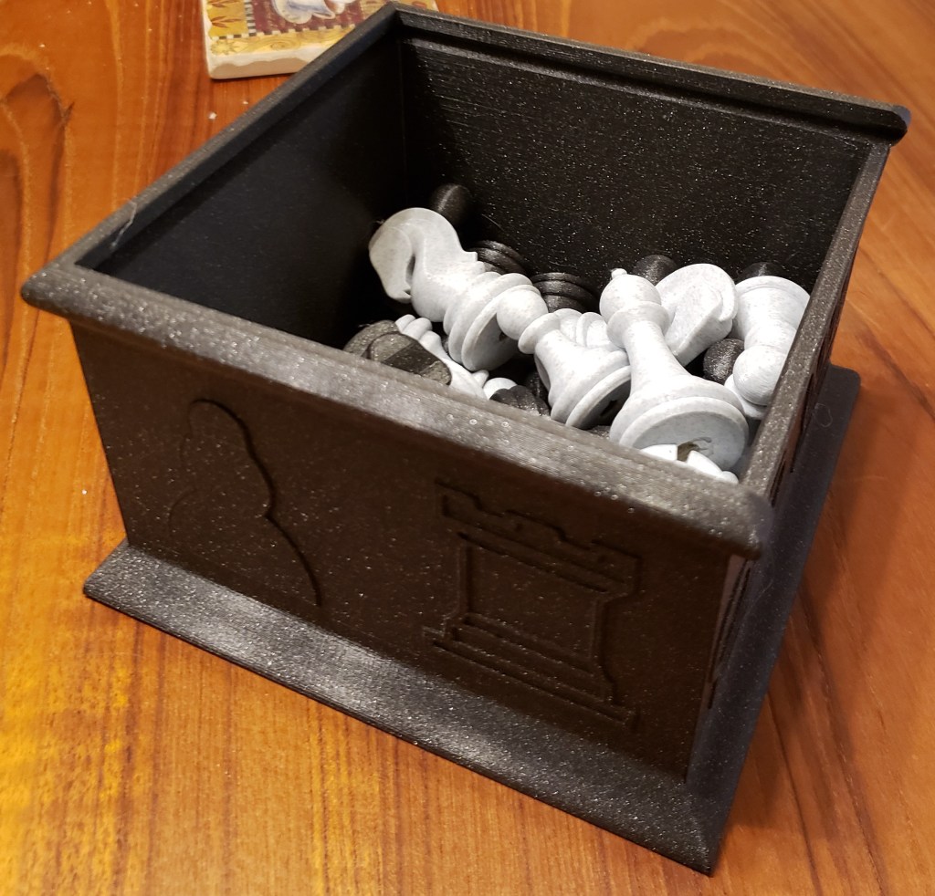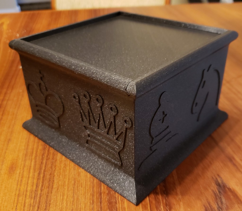 To hold all the chess pieces I made a box with sliding lid. The fit is good enough that it kind of blends in when fully assembled. Embossed along the sides are a symbol of each chess piece type.