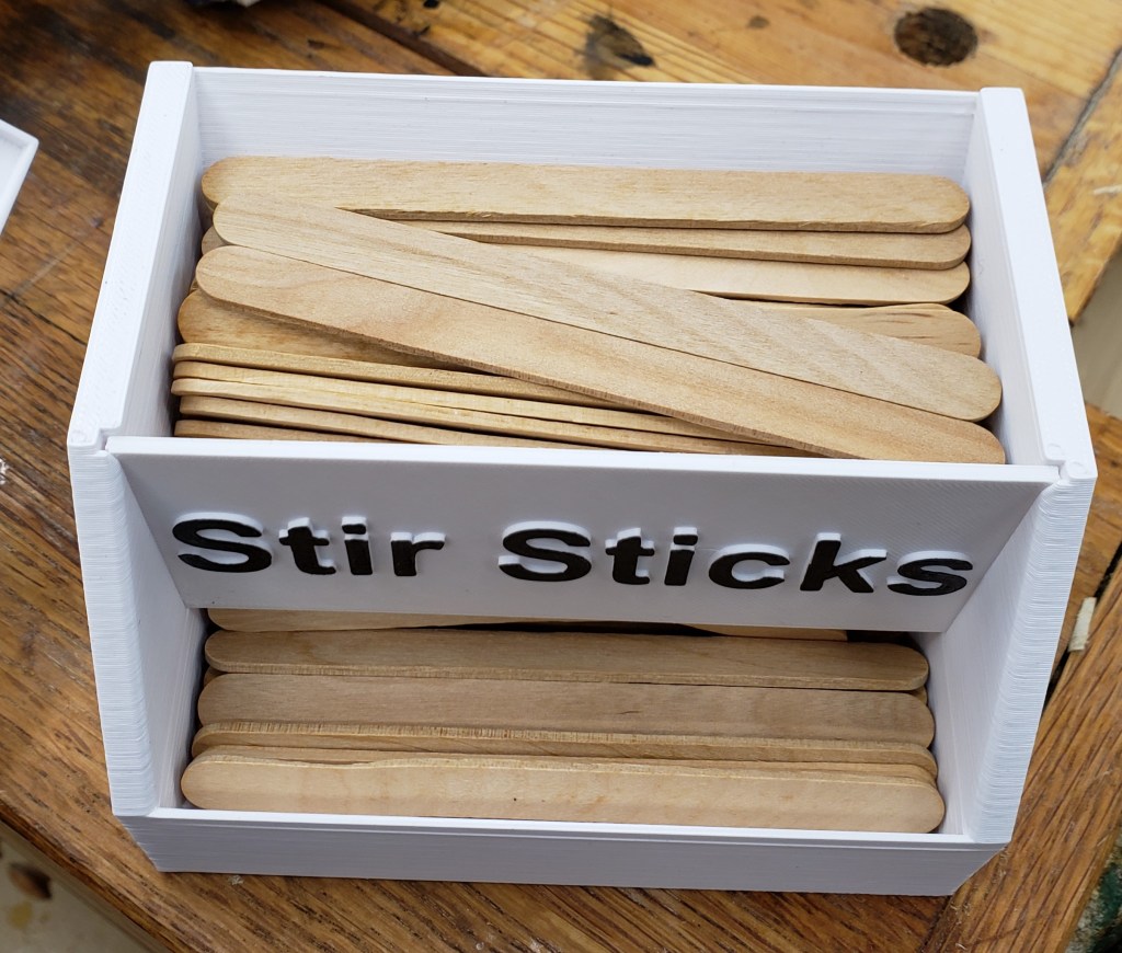 The basic design is the same in all, but with some modification to dimensions depending on what was being dispensed. The front wall slides in and has custom text for each one. A lid keeps the dust out and allows stacking. I printed them with 5% gyroidal infill and a hole in the bottom. That let me use sand to add weight, capping with epoxy. I have been using this trick a lot lately and love doing it. I used hot glue on the bottoms of each, then smashed it down on a silicone mat to make quick non-skid bottoms. The weight from the sand and the non-skid bottoms keep them from moving around easily. You wouldn’t want them to fall off the high shelf they are on.