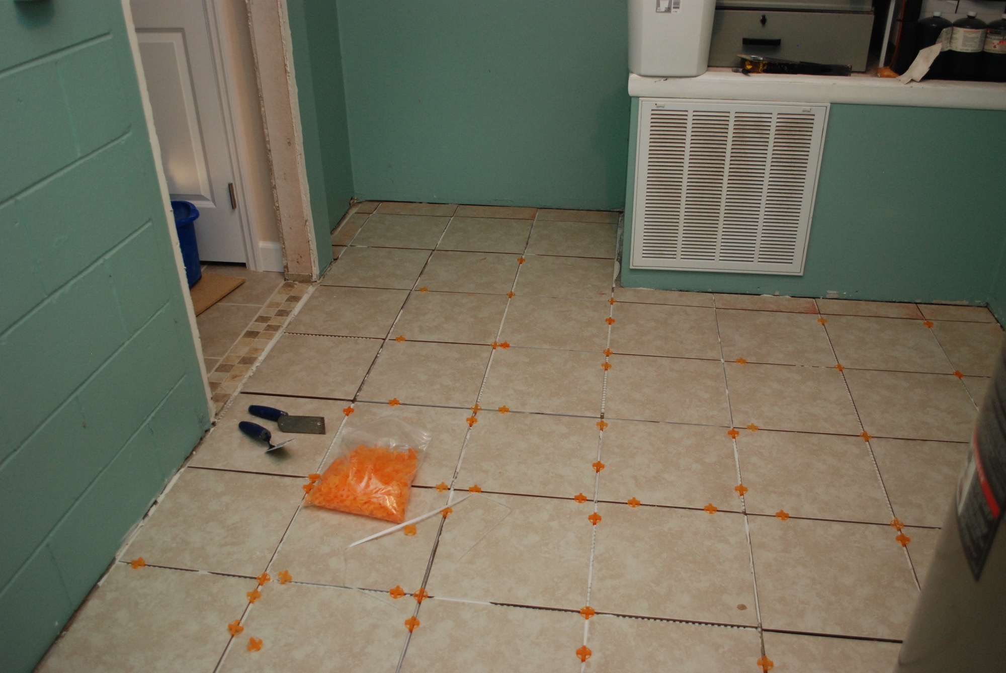 With “demo” done I went to work prepping the floor and tiling. The first day was rough. I got delayed and didn’t do prep on the previous day as I had intended. Thankfully my wonderful wife emptied all the shelves before I got started. More bad luck struck when the bag of mortar ran out sooner than I thought it would. Not a great start, but at least I got most of the tiling done on day 1.