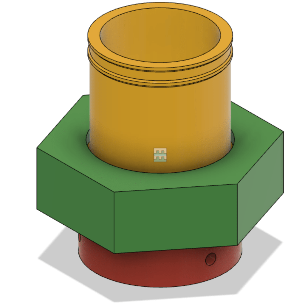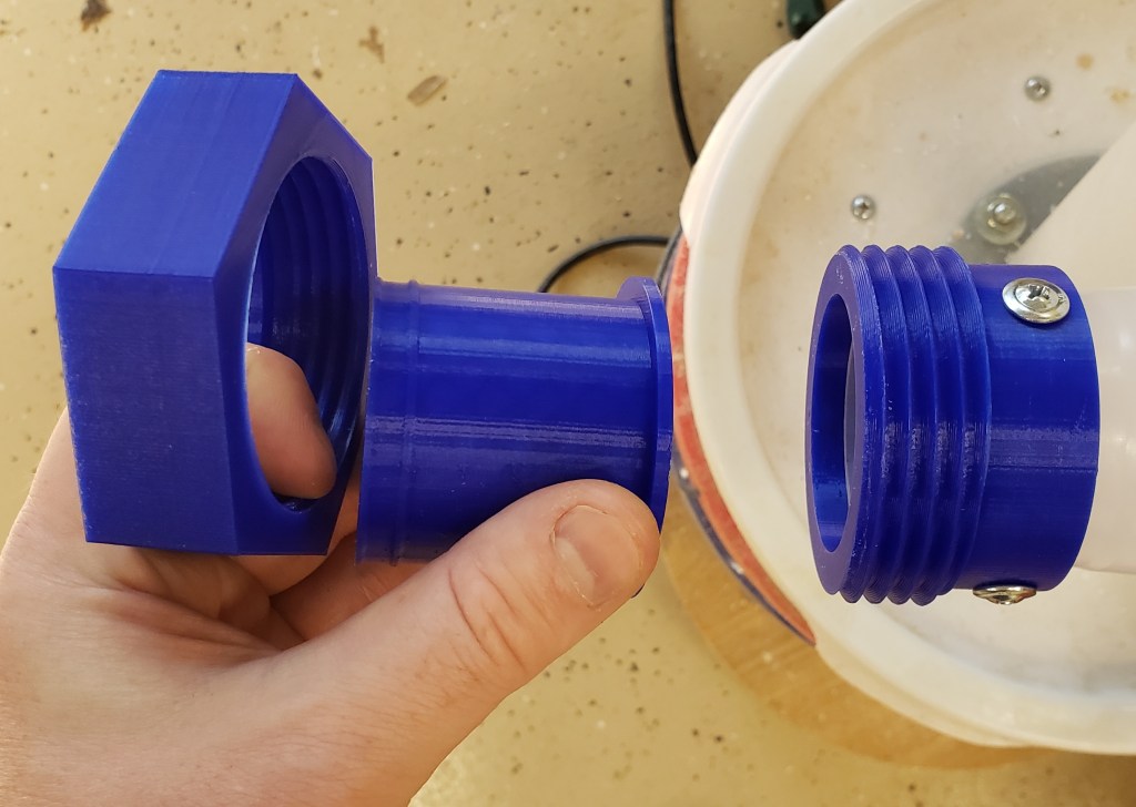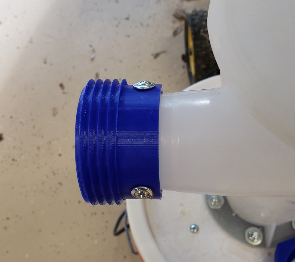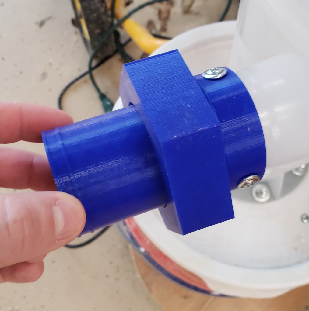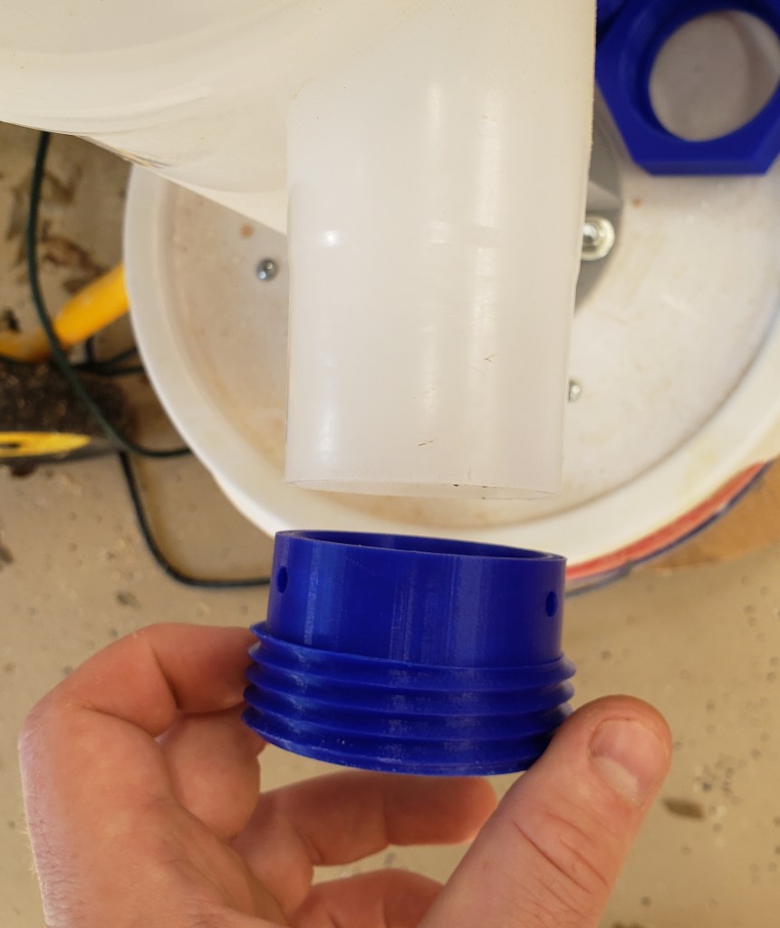I clamped the two together and match drilled the 1/4″ threaded rods that hold the two sections together. I used the circle jig to drill out the 4″ inlet and 5″ exhaust ports. The inlet port is sized to allow a 4″ right angle dust fitting to slip into the top. The bottom goes onto a 4″ tight PVC drain elbow. I custom printed this to work with the parts I had around. I used silicone calking to seal it and screws to hold it in place. The center is larger and will accept 5″ hose to go between the separator and motor. Same method of silicone calking and screws to seal and hold.